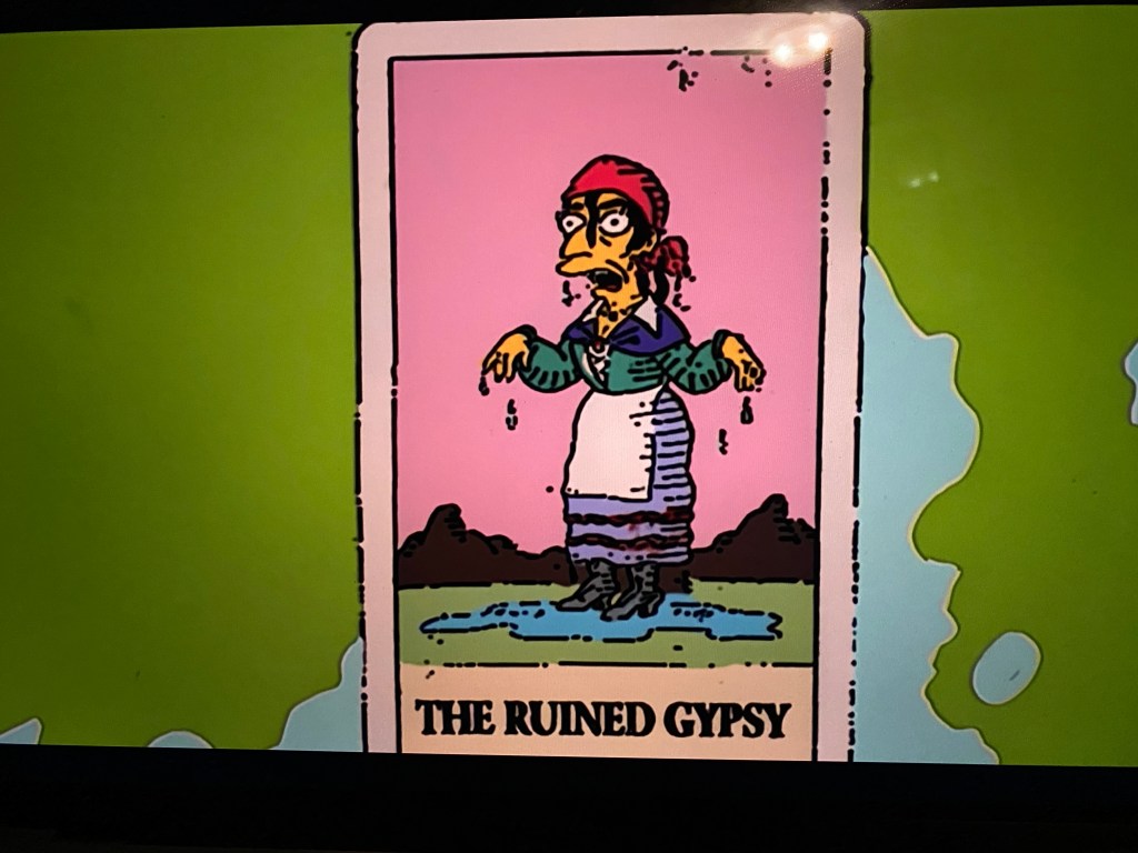 I posed the question to myself to better invite invite a clear answer: “creativity or Tarot?” Then, I turned on a random episode of a random season of The Simpsons, which is always an enjoyable distraction. Just a couple minutes into the episode, we see the Simpsons visit a fortune teller, who has—you guessed it!—Tarot cards sitting on the table in front of her. When Homer accidentally catches himself on fire with one of the fortune teller’s candles and then ruins her shop by setting off the sprinkler system, she exclaims, “I should have seen this coming!” We then see two of the cards that had been laid out on the table. No, we don’t see The Magician or the Ace of Cups; we see “The Flaming Jerk” and “The Ruined Gypsy.”
